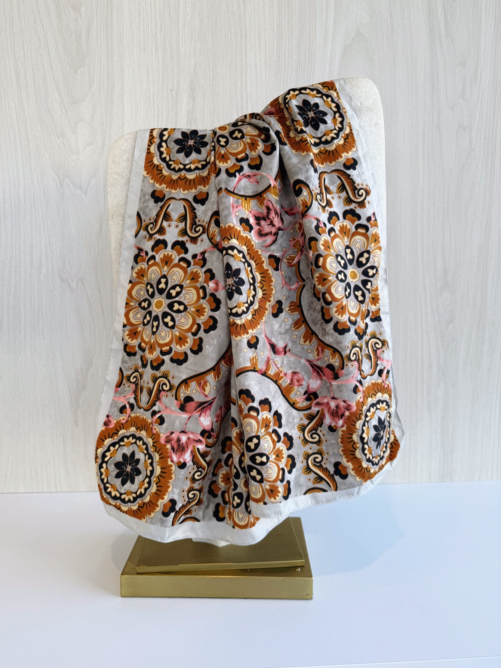 Inspired by the vivid and harmonious colors of a tropical garden at dawn, this scarf captures the peaceful moments of a paradise morning.