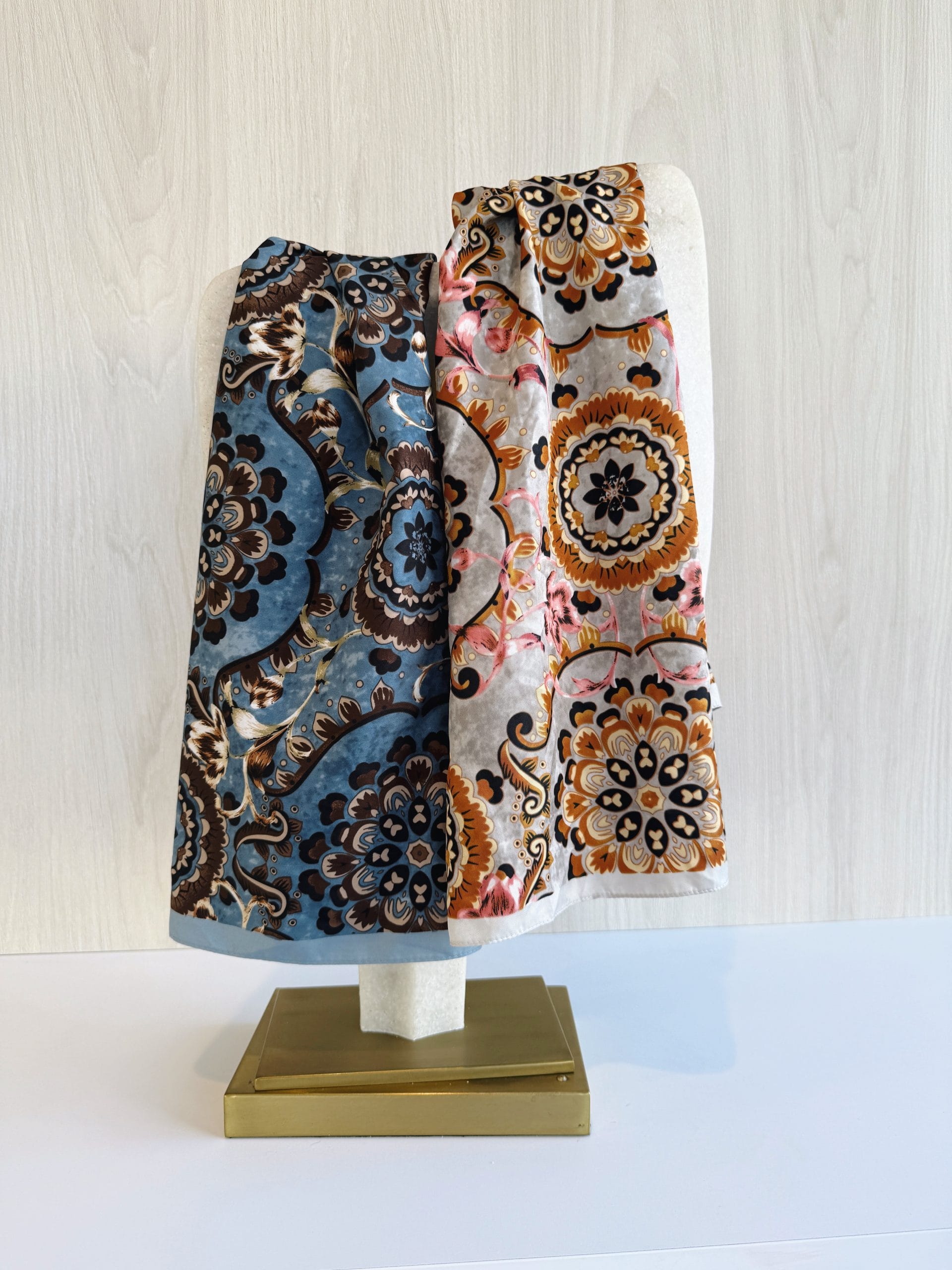 Recommend dry cleaning, hand washing or delicate washing cycle when needed. Store in a safe, dry place away from chemicals or water. Care for your beautiful scarf. If properly looked after, a silk scarf will last an entire lifetime and can become a family heirloom.